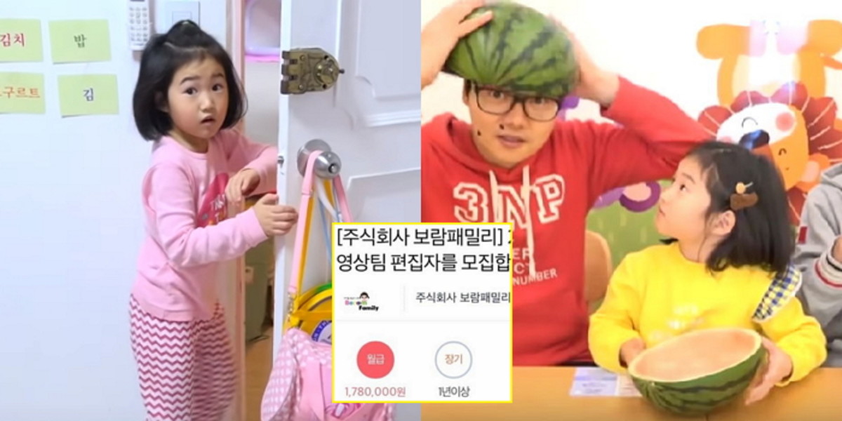 "2020년 보람튜브 영상팀 편집자를 모집합니다"라는 제목으로 올라온 게시물에는 우대 조건으로 4년제 이상 학력과 포토샵 가능자가 적혀있지만 최저 임금보다 적은 월급이 명시돼있다.