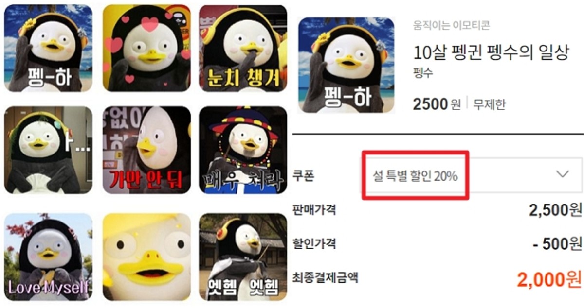 단 쿠폰 사용 기간은 지급 시간으로부터 1일이고 이모티콘 결제창에서 설 특별할인 20% 쿠폰을 적용해야만 할인된 가격으로 결제되니 유의하자.