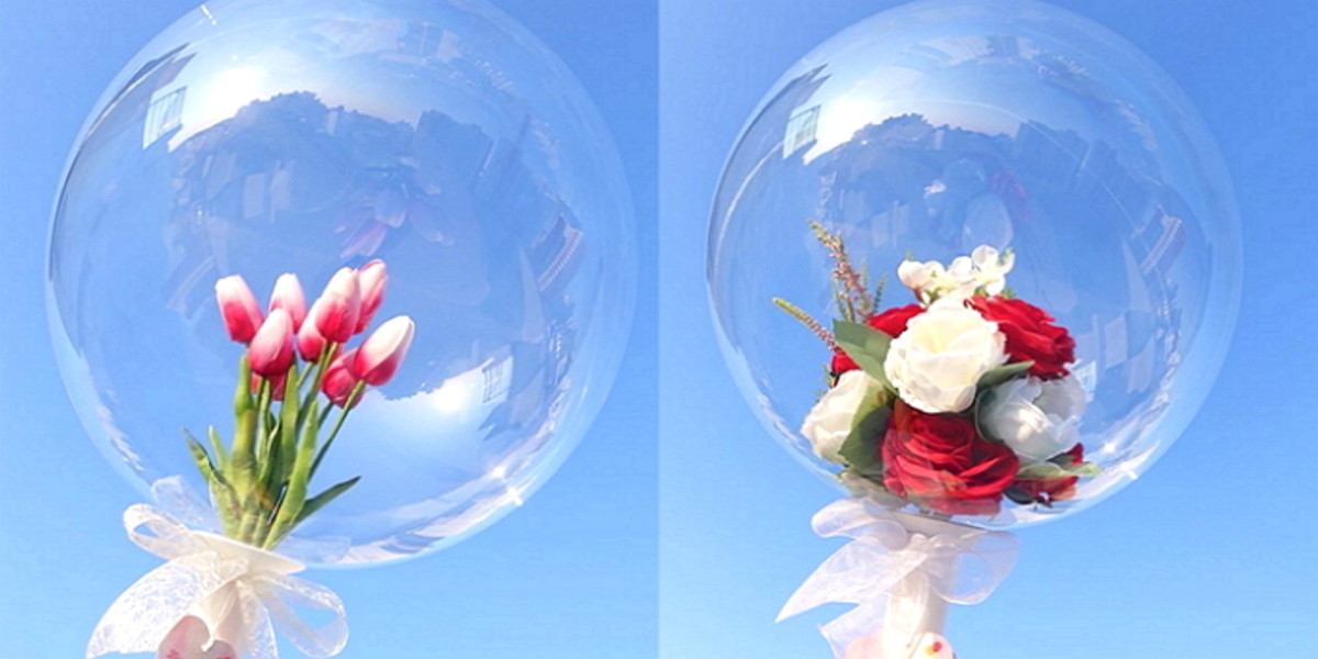 사진 속 풍선꽃은 투명하고 동그란 유리 알같은 풍선 안에 색색의 꽃이 들어가 있는 모습이다.