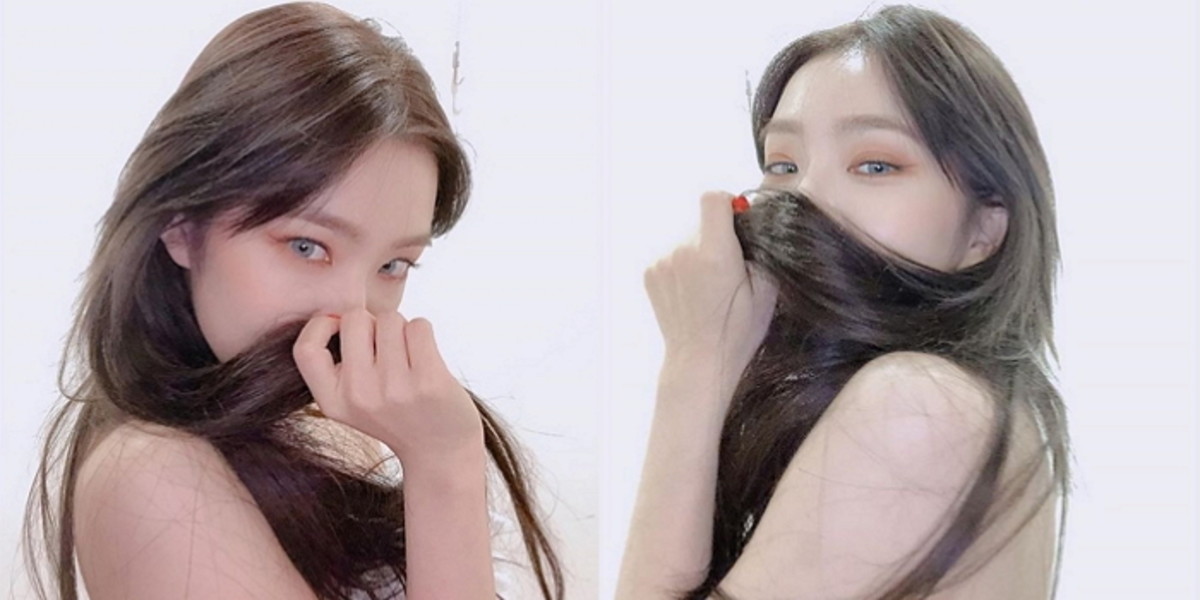 공개된 사진 속 아이린은 오프숄더 드레스를 입고 머리카락으로 입을 가린 채 지긋이 정면을 응시하고 있다.