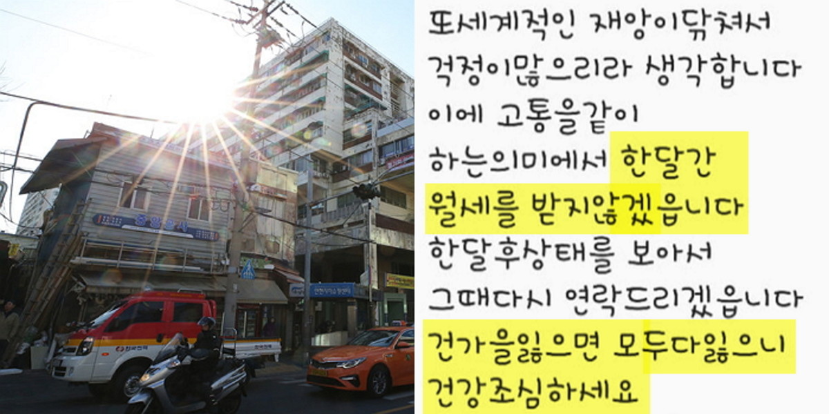 해당 문자 메시지에서 건물주는 "4지구 화재로 많은 피해를 보았는데, 세계적인 재앙이 닥쳐서 걱정이 많으시리라 생각합니다"라고 입을 열었다.