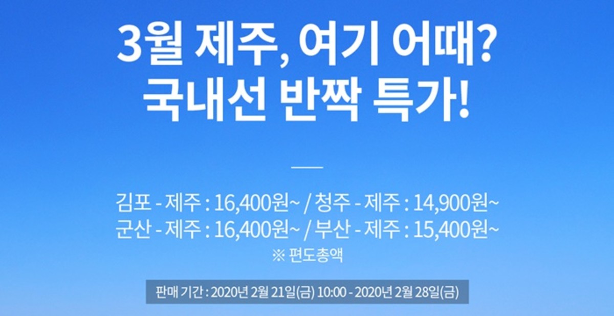 특가 운임은 3월 출발 편을 대상으로 진행되며 편도총액운임 기준 최저가 김포-제주 16,400원, 청주-제주 14,900원, 군산-제주 16,400원, 부산-제주 15,400원부터 예매할 수 있다.
