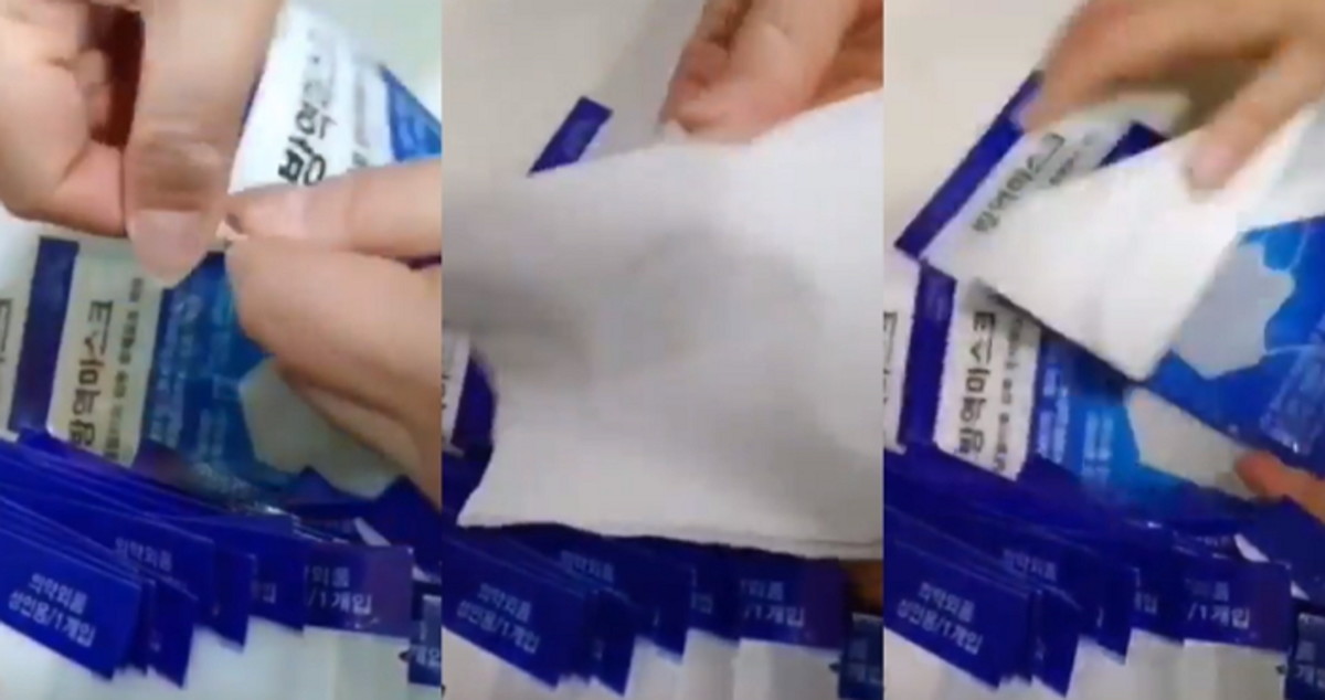 영상은 가히 충격적이다. 수북이 쌓여있는 마스크의 포장을 뜯자 안에서 나온 것은 다름 아닌 휴지로 보이는 얇은 천조각이다.