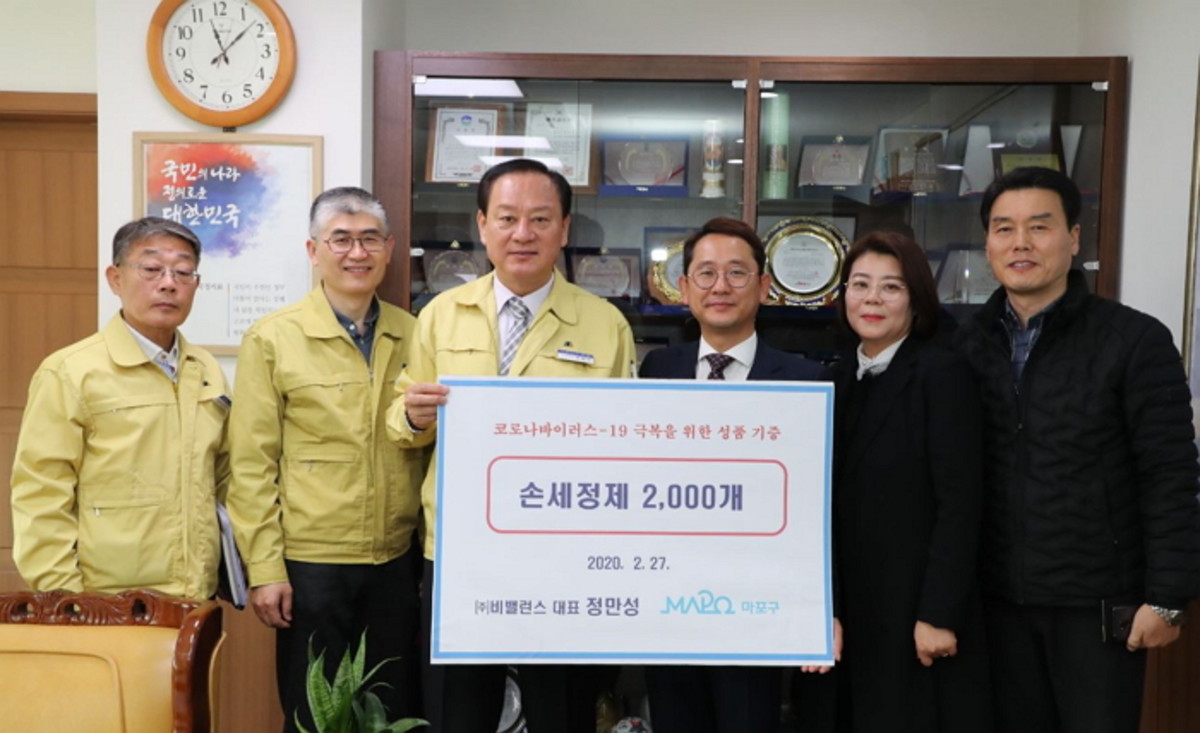 또한, 27일 마포구 성산동에 소재하는 ㈜비밸런스 정만성 대표는 손세정제 2000개를 어려운 이웃들을 위해 사용해 달라며 마포구에 기증해왔다.