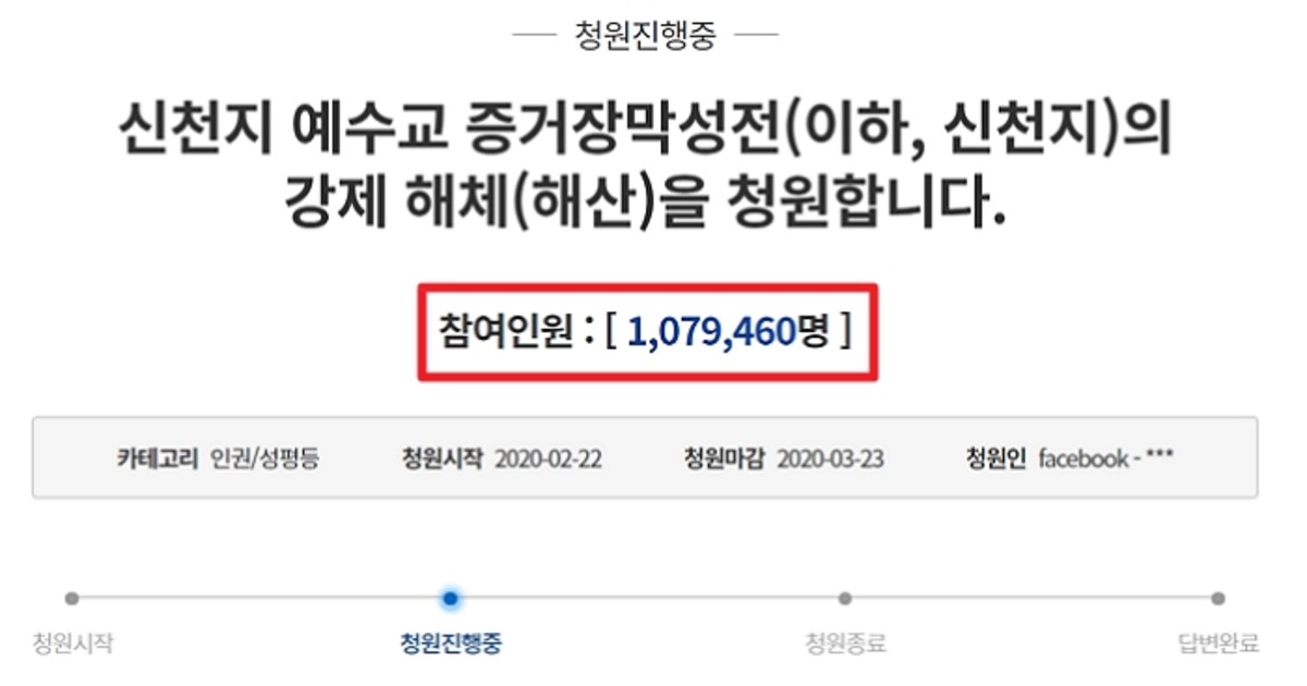 28일 오전 8시 15분 기준 청와대 국민청원 게시판에 따르면 '신천지 예수교 증거장막성전(이하 신천지)의 강제 해체(해산)를 청원한다'는 제목의 게시물이 102만 2,092명의 동의를 얻어냈다.