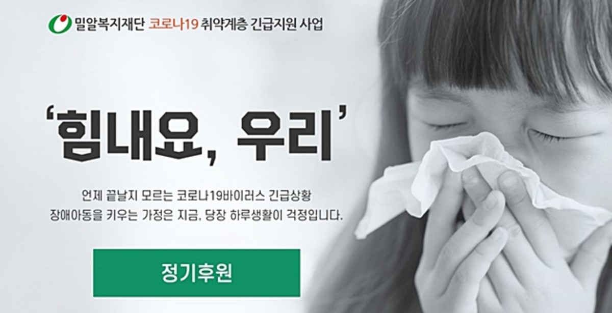 밀알복지재단의 코로나19 취약계층 긴급지원사업 '힘내요, 우리' 후원 동참은 밀알복지재단 홈페이지를 통해 가능하다.