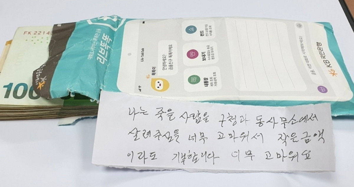 봉투에 동봉된 쪽지에는 삐뚤삐뚤한 글씨로 "나는 죽을 사람을 구청과 동사무소에서 살려주심을 너무 고마워서 작은 금액이라도 기부합니다. 너무 고마워요"라고 적혀 있었다.