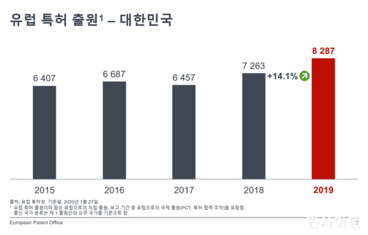 [인사이트] 전준강 기자 = 대한민국에서 신청한 유럽 특허청(EPO) 특허 출원수가 2019년에 전년 대비 14.1% 증가한 8,287건을 기록하며 역대 최고치를 달성했다.