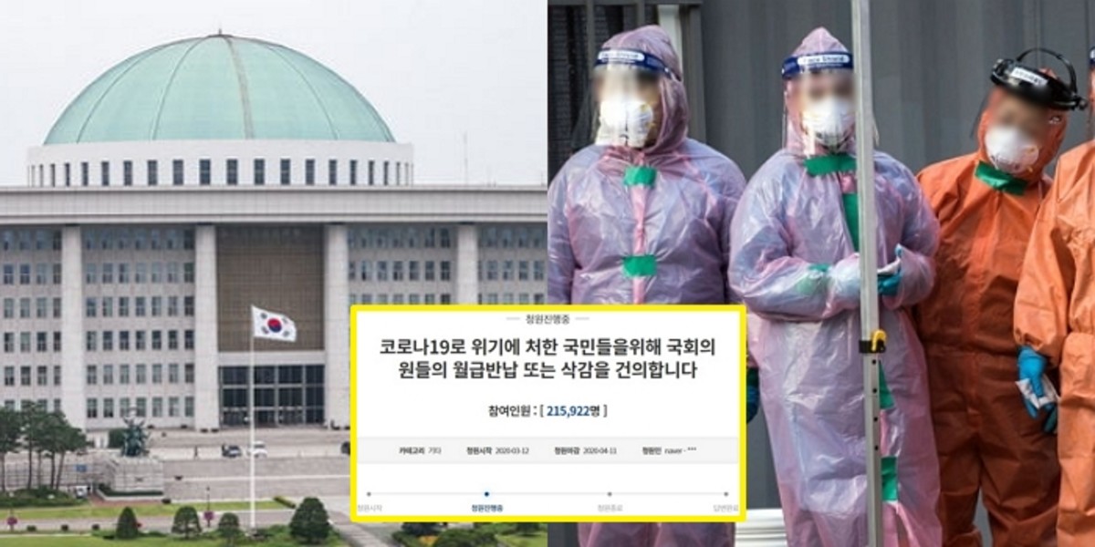 지난 12일 한 누리꾼은 '코로나19로 위기에 처한 국민을 위해 국회의원들의 월급 반납 또는 삭감을 건의합니다'라는 제목으로 청원 글을 올렸다.