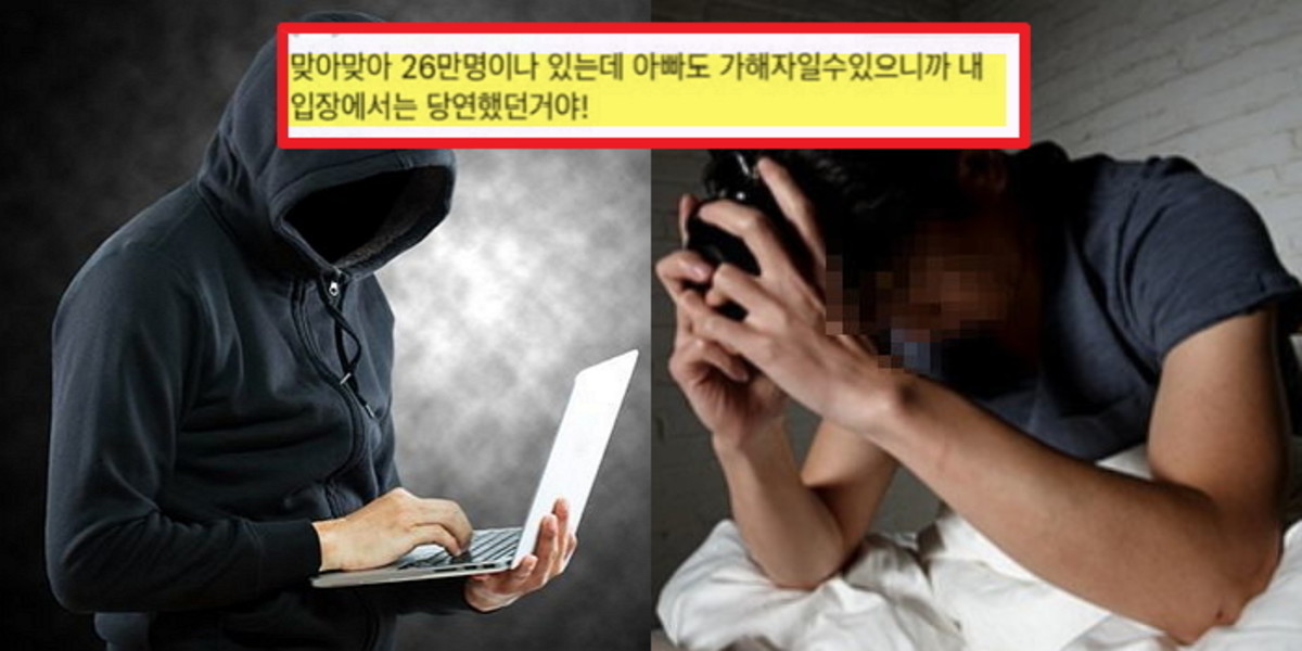 작성자는 "어제 아빠가 소고기 사 와서 우리 딸 고기 먹자고 했는데 무심코 역하니까 말 걸지 말라고 해 버렸다"면서 "n번방 이용자가 26만 명이나 있는데 아빠도 가해자일 수 있으니 내 입장에서는 당연한 것"이라고 주장했다.