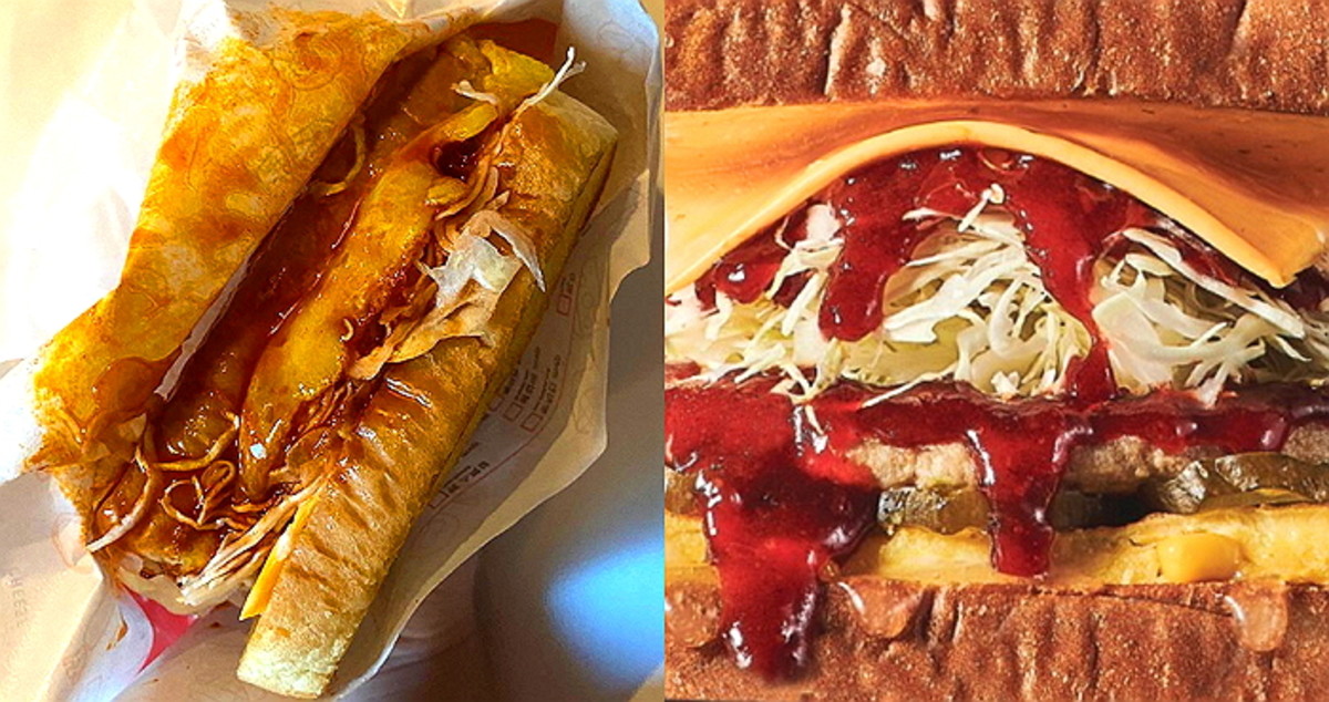 불닭 토스트는 핫치킨 패티와 계란, 옥수수 콘, 양배추, 피클 위로 단짠의 이삭소스와 매운 불닭소스가 얹어져 환상의 케미를 이룬다.