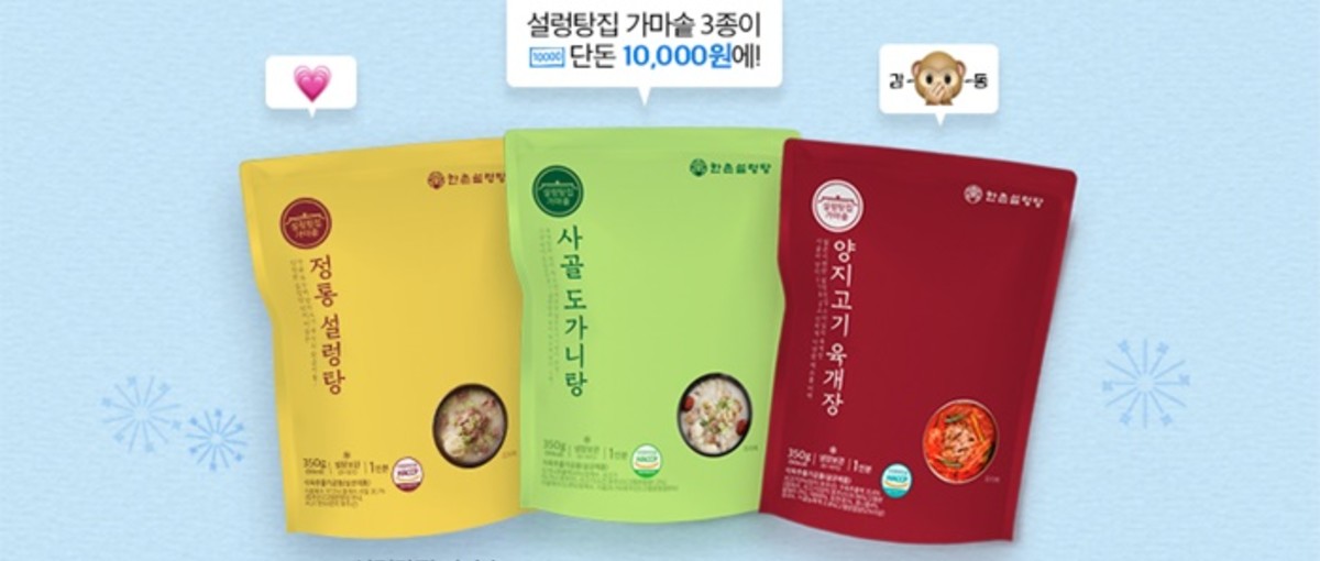 간편식 3종 세트에는 사골 육수와 양지고기 육수의 황금비율로 담백하고 깊은 맛을 느낄 수 있는 '정통 설렁탕', 사골과 양지고기에 다양한 채소를 더해 얼큰하고 시원한 맛을 자랑하는 '양지고기 육개장', 깊고 진한 육수 맛에 육개장과 섞어 먹을 수도 있는 '사골 도가니탕'으로 구성되어 있다.