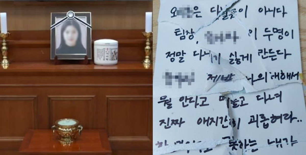앞서 서씨는 지난달 17일 아파트에서 투신해 세상을 떠났다. 그녀는 생전 "팀장과 A씨가 너무 괴롭힌다", "오OO은 다닐 곳이 아니다" 등의 짧은 메모를 유서로 남겼다.