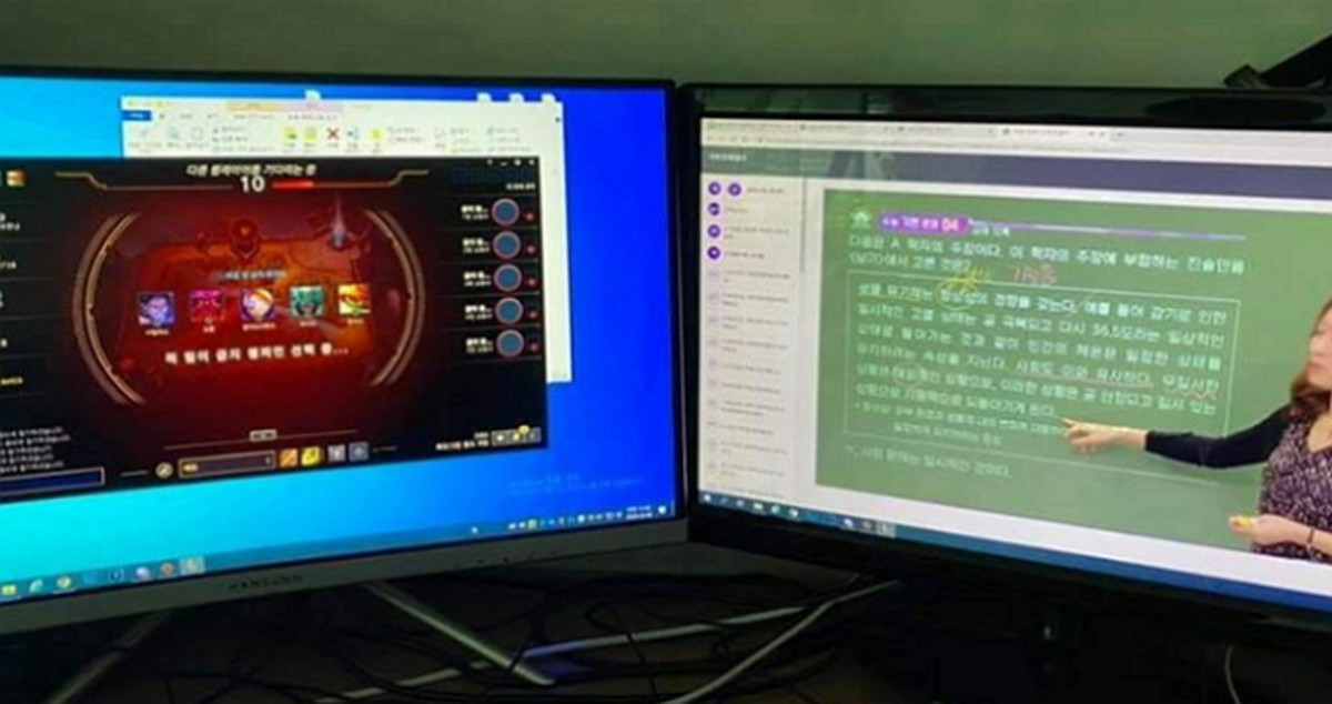 사진 속에는 두 개의 모니터가 나란히 놓여있는데 한 모니터엔 롤 화면이, 다른 한 모니터엔 온라인 강의 화면이 켜져 있다.