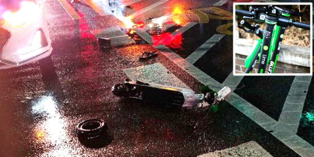 차량과 부딪힌 '라임' 전동킥보드는 사고 충격으로 바퀴가 빠지고 손잡이가 완전히 떨어져 나갔다.