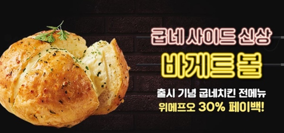 또한, 제품 출시를 기념해 위메프오에서 17일 단 하루 '굽네 바게트볼 갈릭크림'을 포함해 굽네치킨 전 메뉴 가격의 30%를 페이백 지원하는 프로모션을 진행한다.