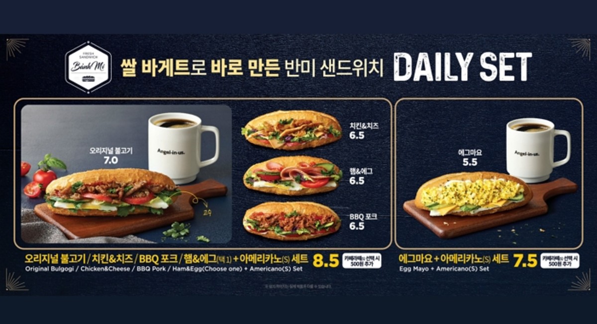 엔제리너스는 신제품 반미 '오리지널 불고기', '치킨&치즈', 'BBQ 포크', '햄&에그'와 아메리카노로 구성한 데일리세트를 8천5백원에, '에그마요'와 아메리카노 세트는 7천5백원에 판매한다.