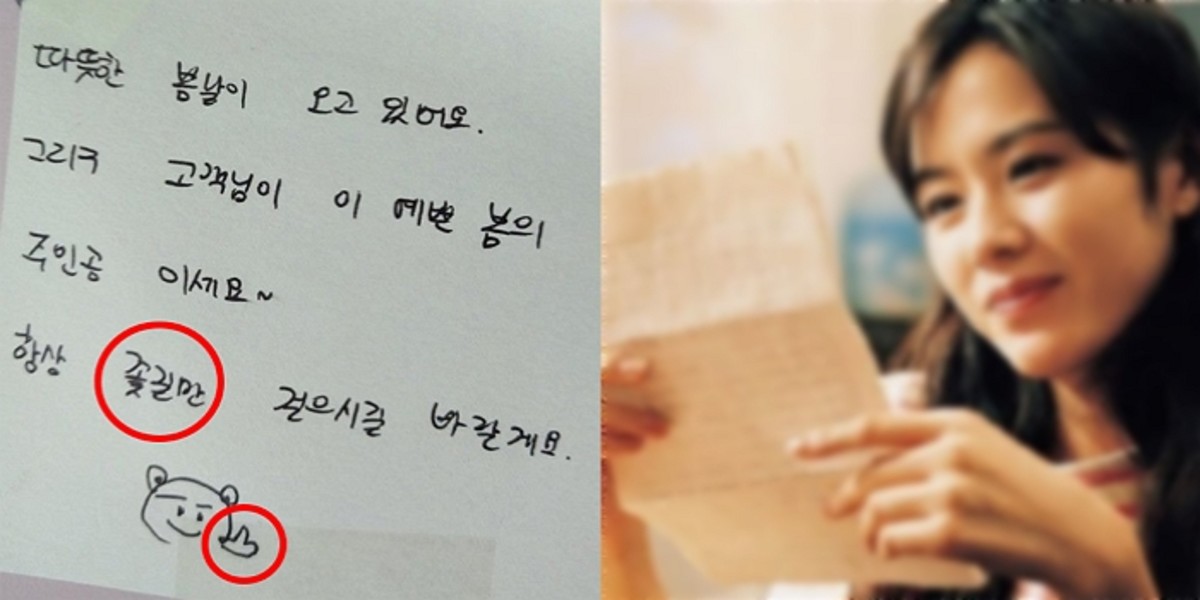 공개된 쪽지엔 "고객님, 따뜻한 봄날이 오고 있어요. 그리고 고객님이 이 예쁜 봄의 주인공이세요! 항상 꽃길만 걸으시길 바랄게요"란 말이 손글씨로 쓰여 있고, 글 말미엔 귀여운 곰돌이 그림까지 곁들여져 있었다.