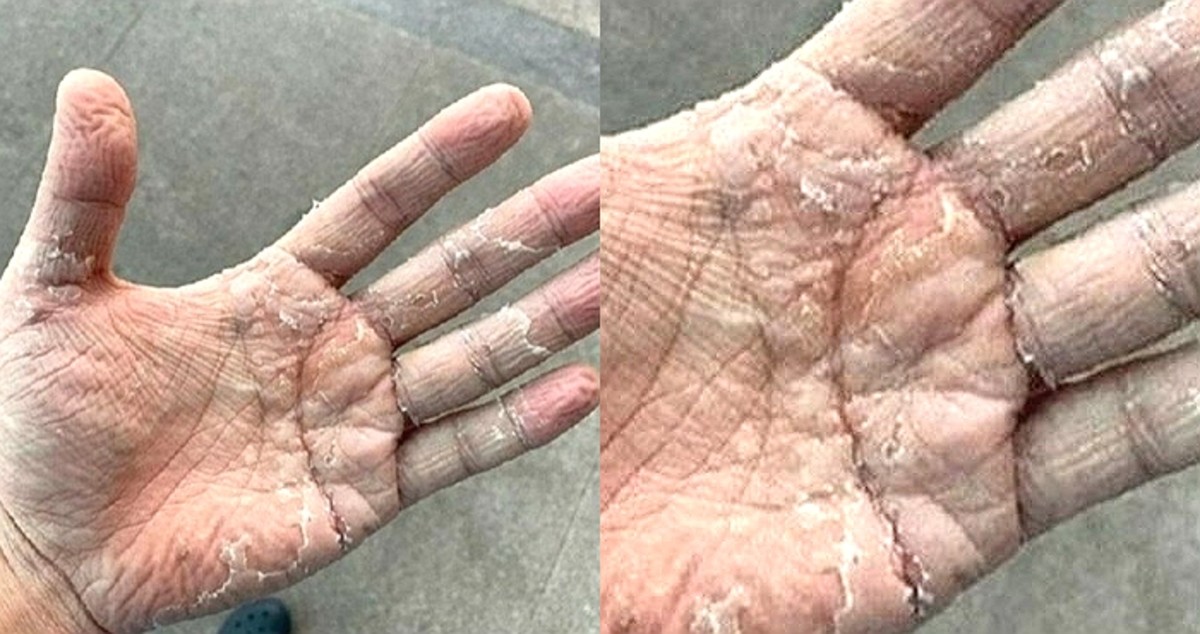 사진 속 손은 퉁퉁 불어 피부가 다 벗겨진 상태였다. 땀과 물에 오래 적셔진 듯 피부는 쭈글쭈글했다.
