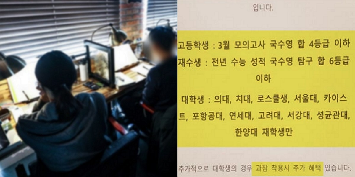 구체적으로 고등학생은 3월 모의고사 국·수·영 합 4등급 이하, 재수생은 전년 수능 성적 국·수·영·탐구 합 6등급 이내인 이들만 예약할 수 있으며, 대학생의 경우 의대·치대·로스쿨·서울대·카이스트·포항공대·연세대·고려대·서강대·성균관대·한양대에 다니는 학생만 예약이 가능하다고 명시했다.