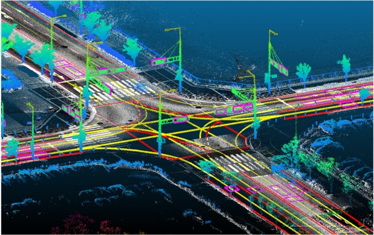 HD맵 데이터는 차량의 자율주행 제어에 필요한 차선과 노면 정보는 물론 차량의 측위에 필요한 도로 주변의 표지판, 신호등과 같은 다양한 시설물 정보도 포함한다.