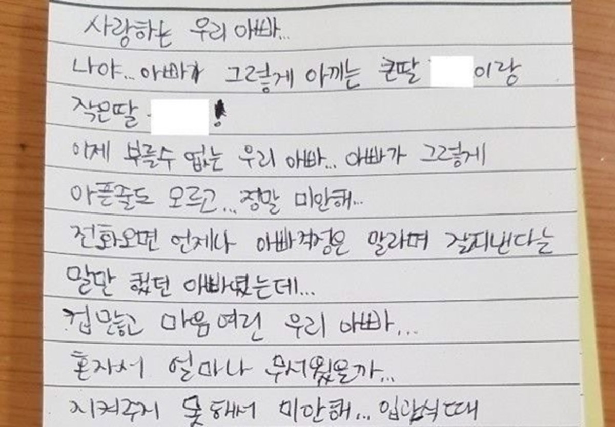 두 딸은 "겁 많고 마음 여린 우리 아빠 혼자서 얼마나 무서웠을까", "지켜주지 못해서 미안해"라며 떨리는 손으로 그리움을 꾹꾹 담아냈다.