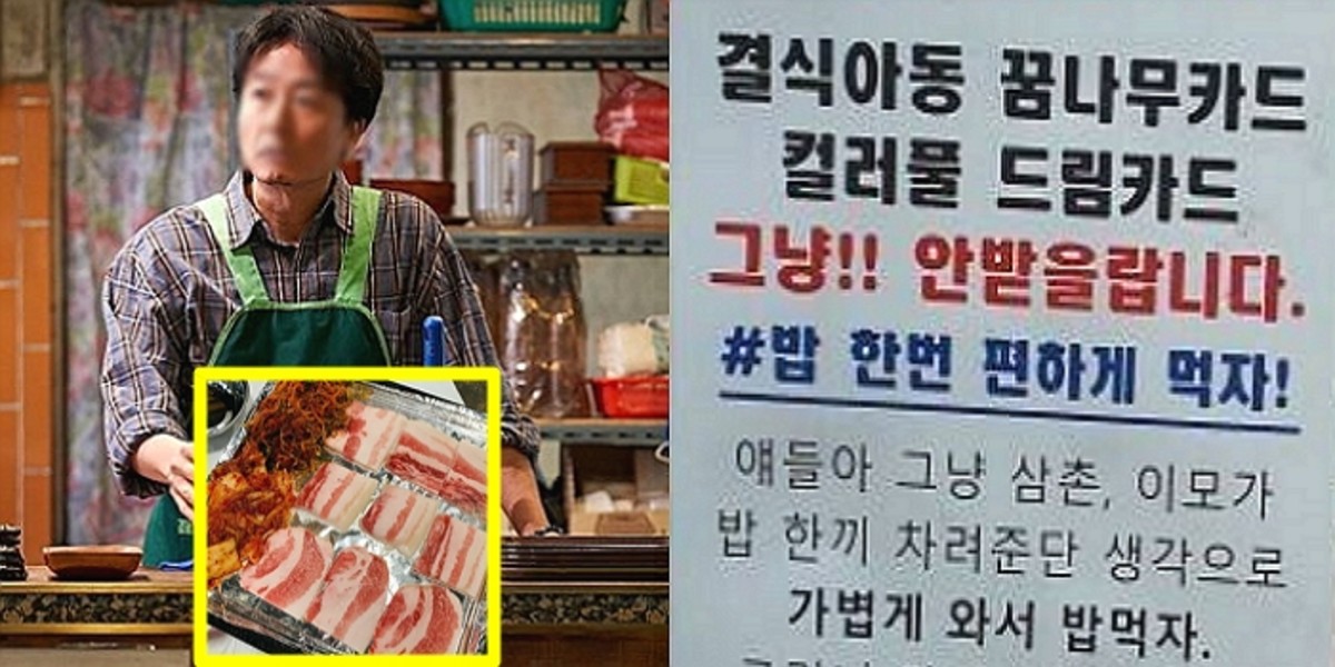 가게 주차장 쪽에 놓인 입간판에는 "결식아동 꿈나무카드 그냥 안 받을랍니다!"라는 말과 함께 "얘들아 그냥 삼촌, 이모가 밥 한끼 차려 준다는 생각으로 가볍게 와서 밥 먹자"는 내용이 적혀 있다.