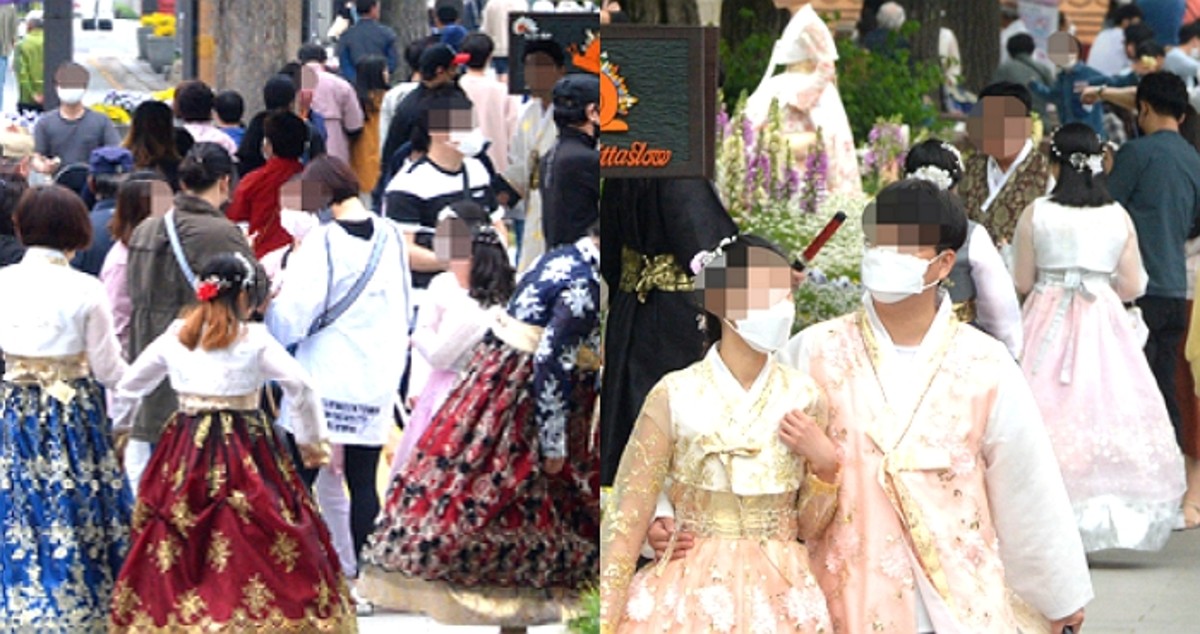 가족, 커플 할 것 없이 한옥마을을 거닐며 길거리 음식을 먹거나 심지어 마스크를 쓰지 않고 다니는 이들도 심심찮게 보인다.