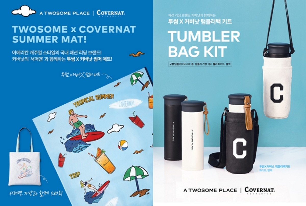 투썸X커버낫 텀블러백 키트는 그립감, 휴대성이 뛰어난 텀블러와 텀블러백 세트로 구성된 제품이다. 투썸X커버낫 썸머 매트는 투썸의 여름 음료와 커버낫의 서퍼맨&서퍼걸, 해변 아이콘이 디자인돼 보는 것만으로도 청량한 바다를 떠올리게 한다.