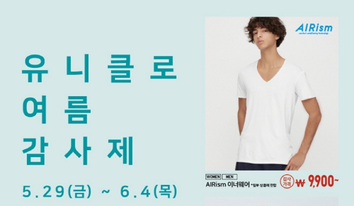 남성용 '에어리즘 크루넥 반팔 티셔츠'와 올해 새롭게 출시한 '에어리즘 마이크로메쉬 탱크탑' 및 여성용 '에어리즘 캐미솔' 등 인기 에어리즘 제품들도 3천원 할인한 9,900원에 판매한다.