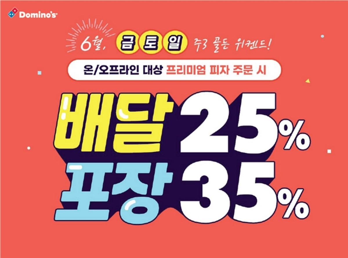 도미노피자는 6월 한달 간 매주 금, 토, 일요일마다 모든 프리미엄 피자를 온라인 및 오프라인으로 배달 주문 시 25% 할인, 포장 주문 시 35% 할인 혜택을 제공한다.