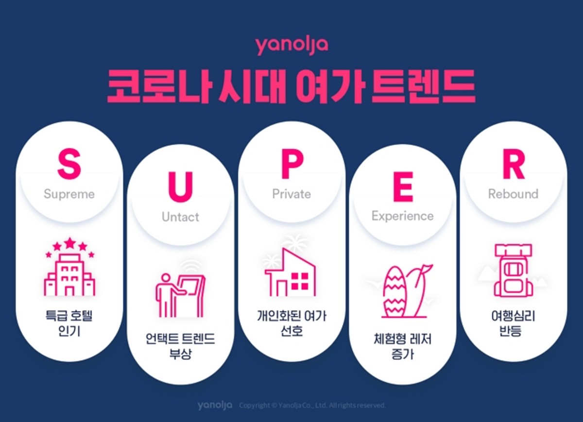 'S.U.P.E.R'는 특급 호텔 인기(Supreme), 언택트 트렌드 부상(Untact), 개인화된 여가 선호(Private), 체험형 레저 증가(Experience), 여행심리 반등(Rebound)을 종합한 것이다.