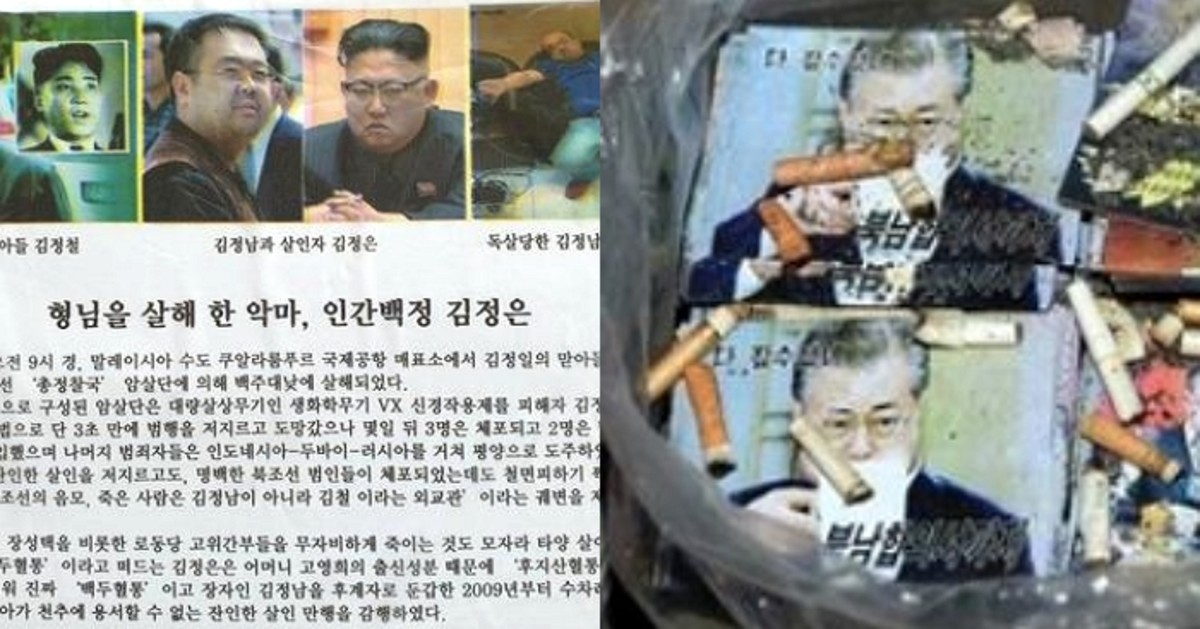 북한이 공개한 전단에는 문재인 대통령을 비난하는 합성 사진과 조롱 문구가 들어있었다.
