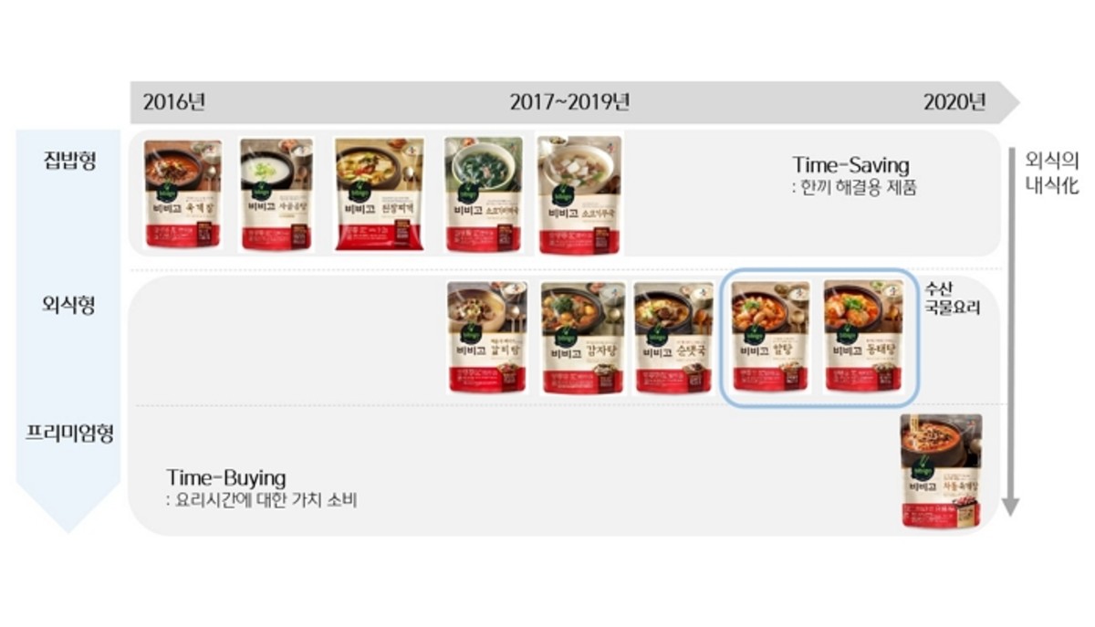 CJ제일제당은 '육개장'을 성공시킨 개발 노하우를 바탕으로 '갈비탕', '차돌된장찌개', '소고기장터국' 등 육류 건더기를 푸짐하게 넣은 제품들로 라인업을 확장했다.