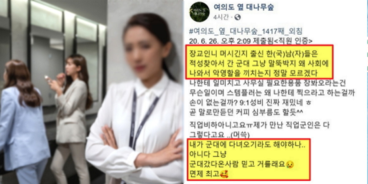 아무리 상사의 지시가 마음에 들지 않는다고 하더라도 모두가 볼 수 있는 공간에 남성 혐오는 물론 군인 비하까지 담긴 글을 게재하는 것은 부적절하는 지적이 나온다.