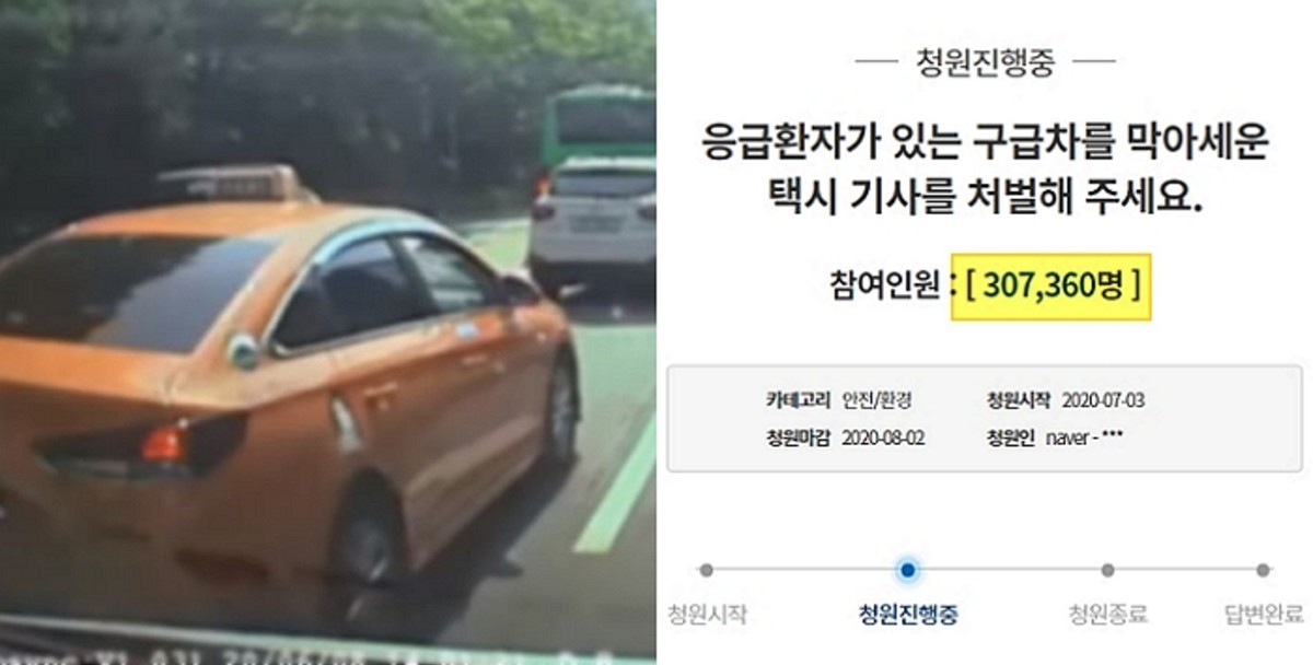 지난 3일 청와대 국민청원 게시판에 올라온 '응급환자가 있는 구급차를 막아 세운 택시기사를 처벌해 주세요'라는 제목의 청원이 게시 하루 만에 답변 기준인 20만명을 돌파했다.