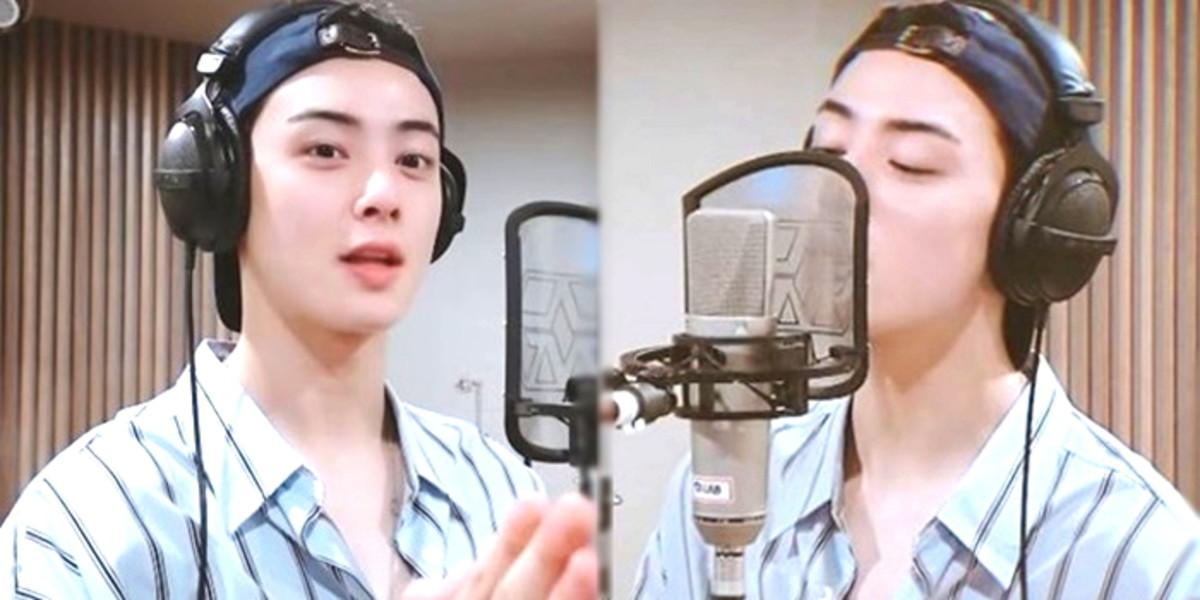 차은우는 녹음실에서 큰 헤드셋을 끼고 '아로하'를 커버했다.