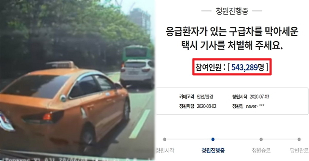 지난 3일 청와대 국민청원 게시판에는 '응급환자가 있는 구급차를 막아 세운 택시기사를 처벌해 주세요'라는 제목의 청원 글이 올라왔다.