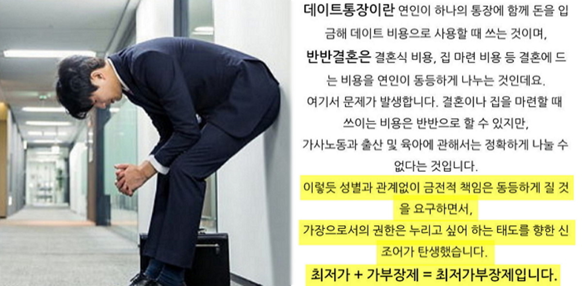 연애할 때 돈을 반반씩 넣어 데이트통장을 만들고, 결혼할 때는 비용을 반반씩 부담하면서 가사노동과 출산·육아는 반반하지 않고 가장으로서 권한은 누리려 하는 남성을 일컫는 단어다.