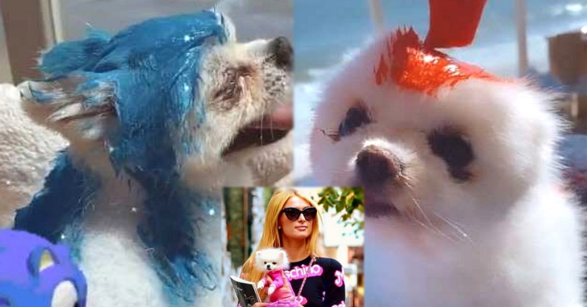 영상 속 패리스 힐튼의 반려견은 몸통이 군데군데 분홍색으로 염색되어 있었다.