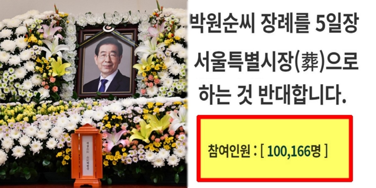 [인사이트] 유진선 기자 = 서울시가 박원순 서울시장의 장례를 5일장 형식의 서울특별시장(葬)으로 치르겠다고 밝힌 가운데, 이에 반대하는 국민청원이 올라왔다.