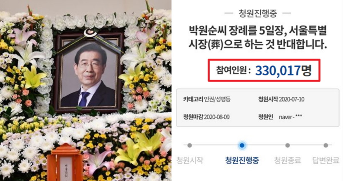 지난 10일 청와대 국민청원 게시판에는 "박원순씨 장례를 5일장, 서울특별시장(葬)으로 하는 것 반대합니다"라는 제목의 글이 올라왔다.
