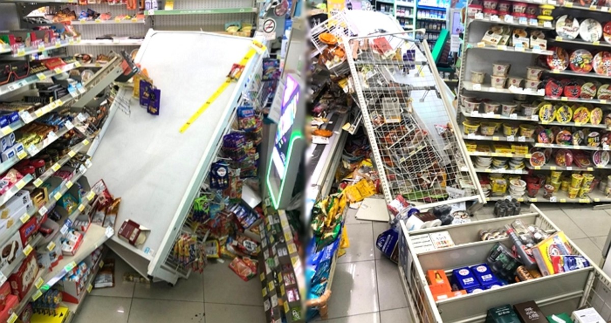 지진이라도 났나 싶을 정도로 엉망이 된 편의점 상태의 원인은 손님 중 한 명이 술에 취해 가판대를 밀어 넘어뜨렸기 때문이다.