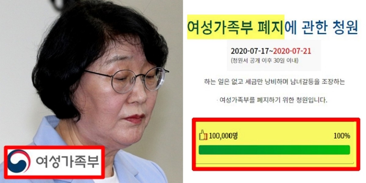 "여성가족부를 폐지해 달라"는 국민의 요구가 담긴 국회 청원이 10만 명의 동의를 얻었다.
