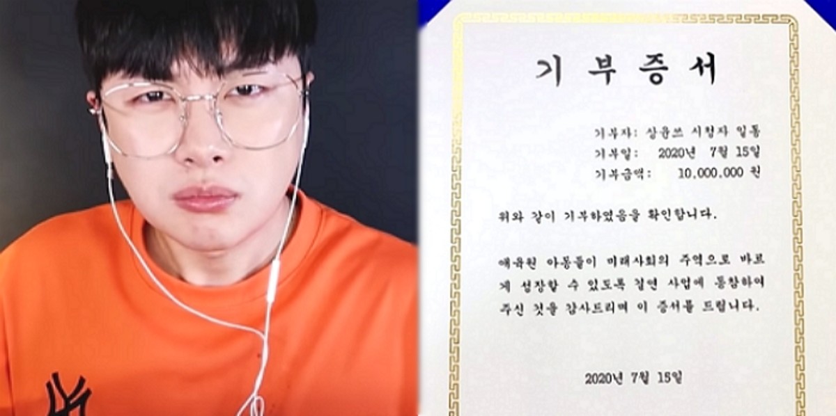 지난 20일 상윤쓰의 유튜브 채널에는 기부증서가 담긴 사진 한 장과 함께 짧은 글 하나가 게시됐다.