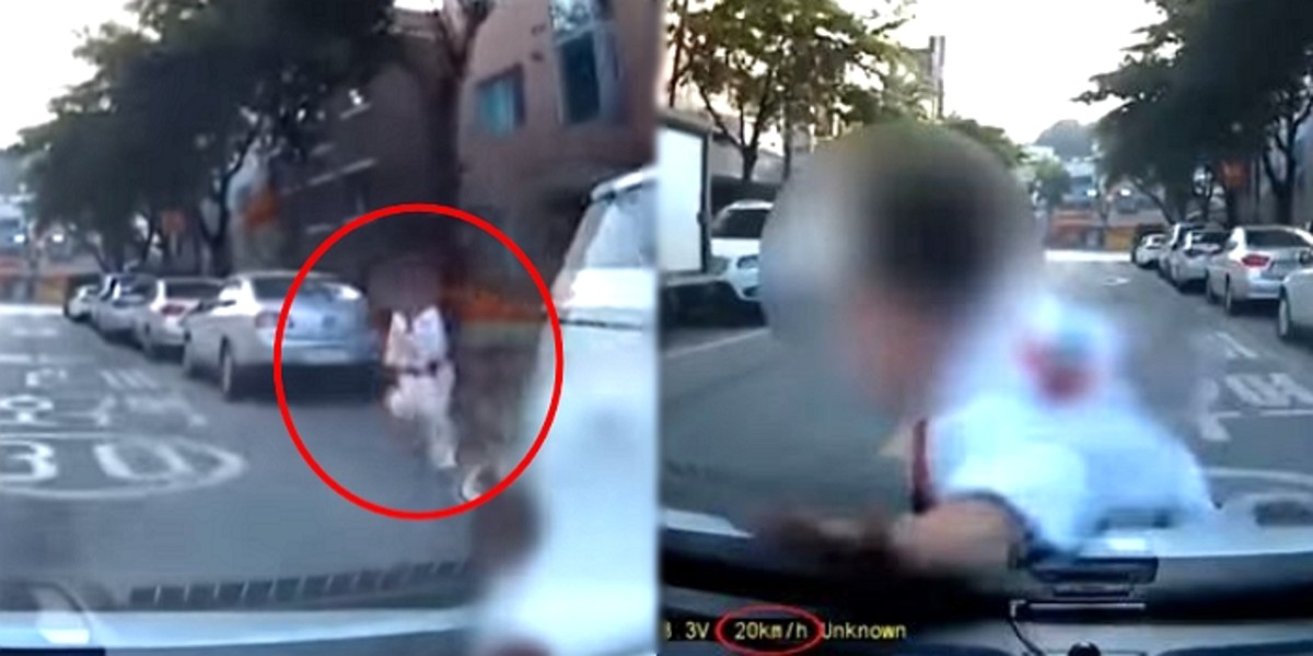 태권도복을 입은 아이는 차와 부딪혀 튕겨 나갔고, 놀란 운전자는 급히 차를 세운다. 아이는 개에 쫓겨 황급히 무단 횡단을 하다 사고를 당한 것으로 알려졌다.