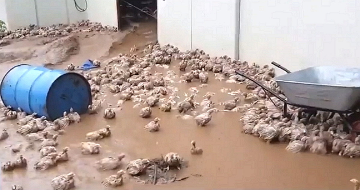 영상 속 양계장에서 쏟아져나오는 흙탕물이 눈길을 끈다. 이 흙탕물 속에는 닭 수십 마리가 휩쓸려 내려오고 있었다.