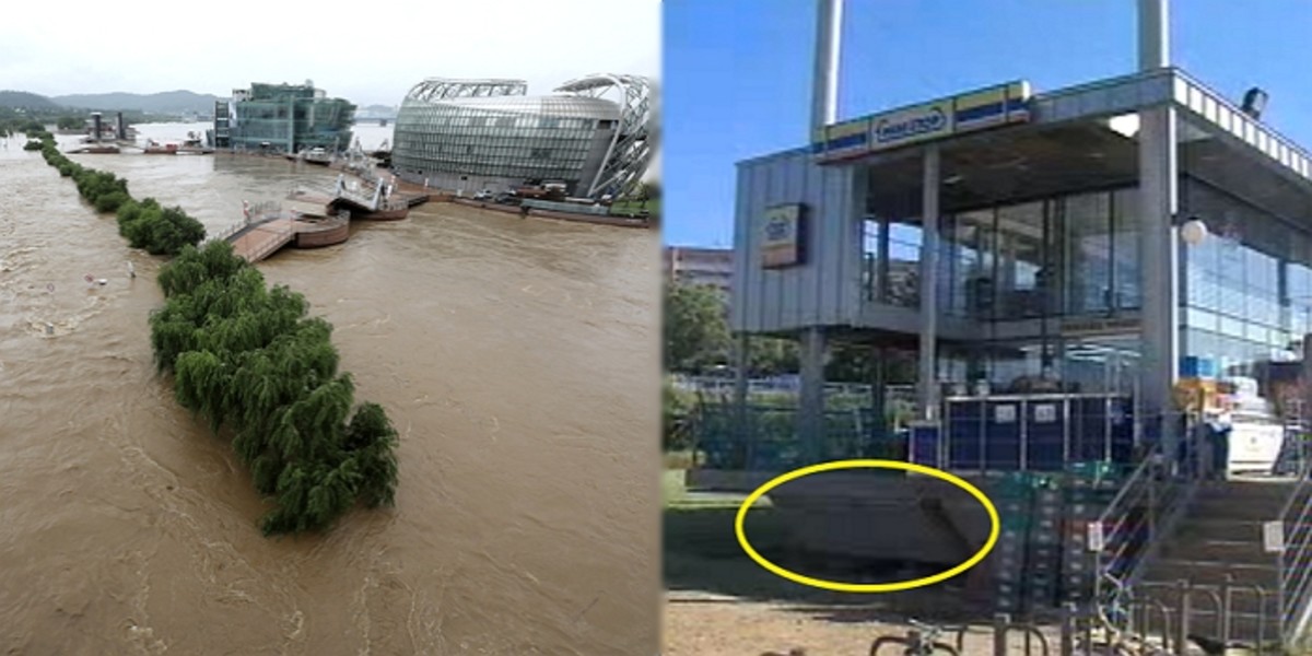 집중호우로 강물이 불어나 키 큰 나무만 머리를 내밀 정도의 상황에서 강변에 위치한 편의점은 뽀송한 상태를 유지하고 있다.