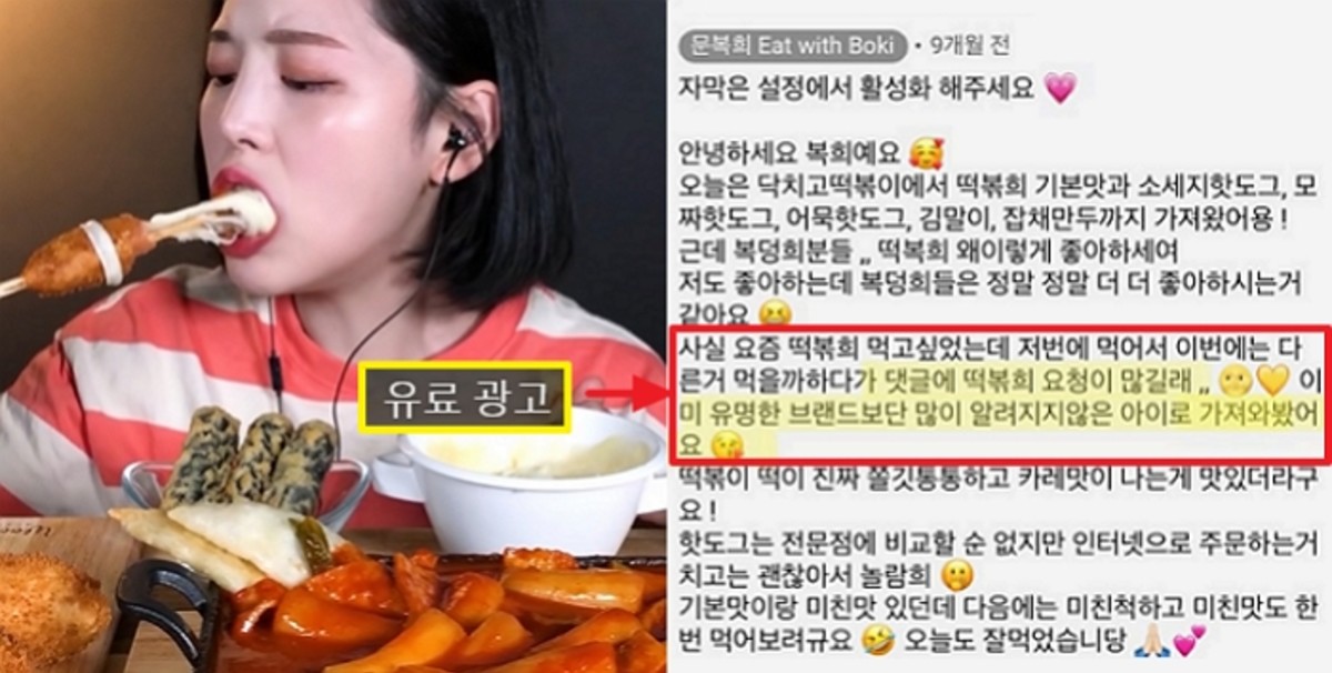 먼저 문복희가 지난해 10월 9일 올린 떡볶이 먹방 영상에 '유료 광고 포함'이라는 문구가 붙었다.