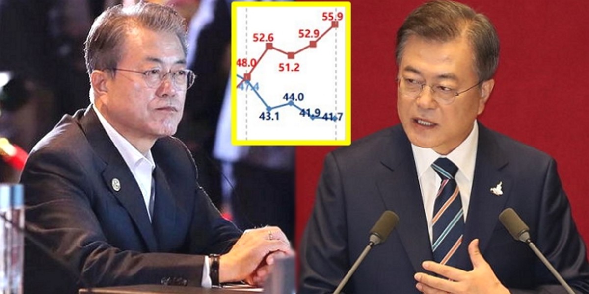 해당 여론조사에서 문재인 대통령의 국정 수행에 대한 부정평가는 55.9%로 취임 후 최고치를 경신했다. 이는 전주 대비 3%포인트 상승한 수치다.